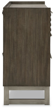 Clean lines lend sophistication and structure to this dresser with mirror. Its complex rich finish contrasts perfectly with a white marble top, while the streamlined silhouette features overlay slats to create visual interest. A metal base and bar pulls in a low-sheen steel finish add to this piece's contemporary vibe.