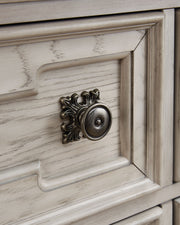 Inspired by the grandeur and grace of European traditional style, this opulent chest of drawers is nothing short of stunning. Its large-scale decorative scrolled pilasters, along with an ash swirl border and walnut inlay crowning the top, are sure to make a sophisticated statement in your restful retreat. A timeless antiqued white coloration and bronze-tone drawer pulls lend an air of subtle elegance to this sumptuous piece.