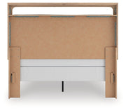 The natural wood tones and clean lines of this queen upholstered panel bed echo your easygoing style sensibilities. With a warm finish and replicated oak grain, its carefree character lightens up your bedroom. Curved inner corner details soften the look, while contrasting brown fabric modernizes the feel. And for added function, warm LED lighting adds serene ambiance at the touch of a button.