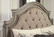Cottage quaint styling and quality construction make this panel bedroom group a dream come true. An antiqued gray finish and beige upholstery provide rustic warmth. The ornately shaped headboard and the framed drawer front marry classic design with homey charm for an elegant bedroom must-have. Traditional cottage design. An outstanding two-tone finish featuring an antiqued gray body with a rich deep walnut brown finish on the tops. Framed drawer fronts and overlay decorative corbels dress the cases nicely. Ornately shaped headboard with inset upholstered cushion and matching mirror frame. Dovetail drawer construction with ball bearing side glides. Bails and knobs are finished in a dark bronze toned color.