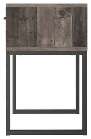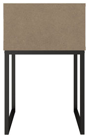 Streamlined design and a stunning finish come together in one simply extraordinary piece. This single drawer nightstand is sure to impress with canted metal legs and a rustic butcher block finish over replicated pine grain texture. Its mid-century profile is a nod to the past, while the updated finish keeps it solidly in the present.