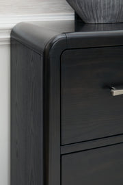 Inspired by art deco design, this softly shaped dresser with mirror makes a lasting impression in a simply stunning way. Its magnificent curved silhouette is enhanced by a rich layered black finish on the textured wood grain surface. This is the statement piece you’ve been dreaming of to elevate your contemporary inner sanctum.