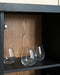 If your love of entertaining is only surpassed by your love of sleek, versatile style, this bar cabinet expertly suits your needs. Racks for wine bottles and glasses neatly store necessities for a pour of vino. Adjustable shelves comfortably hold additional bottles, dishware or drink-making accessories. For added flexibility, the cabinet's black and natural brown finishes effortlessly pair with your home’s existing aesthetic. Doors with softly curved glass inserts allow this chic piece to double as a display space.