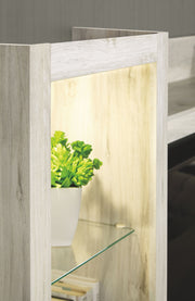 Express your farmhouse style with this entertainment center. Its wispy white finish over replicated oak wood grain is a delightful change from the ordinary. Clean-lined, classic styling with barn door inspiration provides a country chic aesthetic that’s a breath of fresh air. Its combination of cabinet storage and open display space with LED lighting makes for just the right mix. What really turns up the heat: an electric infrared fireplace insert with faux firebrick surround that operates with or without infrared heat and includes a multi flame feature, 7-level temperature setting, five brightness levels and LED glowing embers effect.