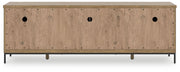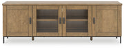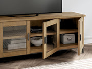 Made for the everyday, this TV stand is a sleek complement to your casual contemporary living room. You’ll love the refined-yet-relaxed vibe of its contrasting medium brown finish and matte black legs. Concealed and glass-front cabinets make media storage a breeze. And for added function, cord management holes throughout the piece make connections easier.