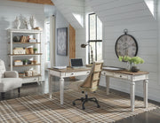 Elevating the art of traditional cottage styling, this L-shaped desk is your heavenly home office realized. Two-tone finish combines chipped white with distressed wood tone tops for added charm. Framed drawer fronts, decorative corbels and elegantly turned and tapered legs add refinement, while dark bronze-tone knobs lend a classic touch.