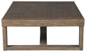 Oversized yet far from overdone, this designer coffee table masters the art of simplicity. Bold, blocky profile is enriched with plank-effect styling and a textured grayish brown finish for a look that’s cool and contemporary and a vibe that’s warm and inviting. Its generous scale makes it a natural complement for spacious sectionals.