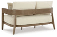 Elevate the appeal of easy-breezy living with this outdoor package. Made to look like wood yet durable enough to weather the elements, it's sure to serve you and your besties well, year after year. The gently curved piece features cushions wrapped in Nuvella+™ high-performance fabric for plush refinement. Patterned accent pillows infuse delightful texture. The gently curved chair features cushions wrapped in Nuvella+™ high-performance fabric for plush refinement. Go ahead and take a smooth spin.