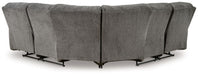 Cozy comfort is on the rise with this reclining sectional. So velvety soft, the trendy pewter-hued chenille upholstery is made for everyday indulgence. Overstuffed and stylishly wrapped, the sumptuous cushions and pillow top armrests display the comfortable side of contemporary. A padded center console with hidden storage and dual cup holders blends form and function. And with one easy pull, you're on your way to endless relaxation with plenty of room to stretch out.