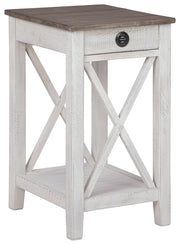 Modern meets vintage in this accent table. Made of wood, it creates a vintage vibe with a distressed white and gray finish and crossbuck supports on two sides. Two USB charging ports add modern function. This is a must-have piece for your living space.
