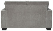 Sporting clean lines and sleek track arms, the decidedly contemporary profile is enhanced with plump cushioning and a chenille-feel upholstery, so pleasing to the touch. Sure to play well with so many color schemes, this loveseat includes a pair of understated floral pattern pillows for fashionably fresh appeal.