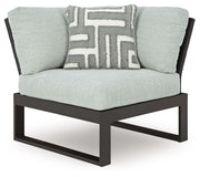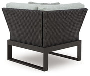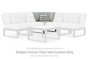 This outdoor corner chair with cushion is made with aluminum, resin wicker and Nuvella+™ (polyester) UV-resistant, cleanable fabric. Pairs with other items in the series to make an outdoor sectional.