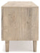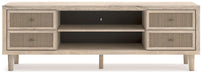 Clean-lined and contemporary—but far from stark—this TV stand is a fresh style awakening. Pairing a light finish with replicated oak grain and textured beige cane details, its mixed materials bring a naturally versatile vibe to your favorite spot for binge-watching or gaming. Sleek, simple hardware plays perfectly with the modern aesthetic. And prepare to have your mind blown by the vast universe of storage possibilities within the spacious drawers and open shelving.