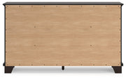 Feast your eyes on this richly versatile dresser. Its traditional-inspired dark brown finish effortlessly blends with contemporary bright nickel-tone pulls to create a stunning look that's not too stuffy or too trendy. Spacious drawers offer plenty of storage for your wardrobe and spare bed linens.