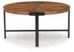 This occasional table set contrasts a rich brown wood tone with dark bronze-tone metal legs for a casual contemporary feel. An inlay sunburst pattern on the tabletops channels both modern aesthetics and the comforting vibe of natural materials. Complete with a coffee table and matching end tables, this set is sure to add chic character to your living space.