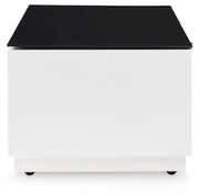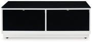 Combining a high-gloss white finish with a black glass tabletop, this coffee table proves opposites really do attract. It's the perfect blend of modern style and functionality, with two roomy drawers for storing essentials and a large open display shelf for decorative items. Want to rearrange the furniture? Casters make it easy to adapt to any situation.