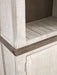 Casual farmhouse design. Made with Pine solids and veneer with engineered wood substrate. Two-tone finish scheme with distressed weathered gray tops and trim set on distressed vintage white case. The 67” wide TV stand features open shelving on the ends with two framed doors in the center. Turned posts provide a vintage charm. Matching piers and bridge complete the full size wall. Round metal knobs are finished with an aged iron color. W814-68 TV stand measures 74" wide, features four doors with two adjustable shelves in the right and left cabinets and a single adjustable shelf behind the center glass front doors. An open center cubby space for electronics and cord management holes throughout.
