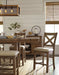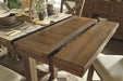 Made with Rubberwood solids and Acacia veneers. Casual rustic design with planked effect on table top. Table extends to fit 8 with two end leaves. Alternate seating available with the cushioned bench. Matching server offers plenty of storage options. Collection is finished in a distressed nutmeg brown color.