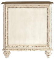 Elevating the art of traditional cottage styling, this chairside end table is sure to serve you beautifully for years to come. Antiqued two-tone aesthetic blends a chipped white with a distressed wood finished top for added charm. Cabinet door features inset mirror with filigree moulding for a fanciful twist.