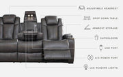 Looking for seating with all the bells and whistles? This loaded power reclining sofa has you covered. Get double the relaxation—recline your body then adjust your headrest. Pull down the middle seat to reveal a drop down table ready to hold your magazines and remotes. With USB charging ports, your devices will enjoy this sofa, too. Stainless steel cup holders accompany you on either side. All wrapped up in quality faux leather with fashion-forward jumbo stitching for a look and feel you’ll love.