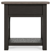 Quality crafted and richly styled, this rectangular chairside end table is sure to charm. Its two-tone aesthetic pairs a weathered grayish brown tabletop with a textured wire brushed base in black. A built-in shelf offers handy display space. And the table's integrated 110V power supply and dual USB charging ports make it so easy to keep your personal devices powered up.