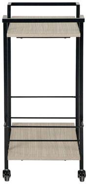 Display your favorite beverages with this rolling bar cart. Constructed of metal in a finish with wood grain effect melamine shelves, this cart blends easily with your existing living room aesthetic. A protective rail surrounds the shelves, keeping bottles and glasses from spilling. Lockable casters serve up drinks and snacks in style.