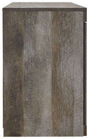 This TV stand is sure to win your heart with its daring take on modern rustic design. Its crisp, clean minimalist-chic profile is enriched with a striking replicated oak grain, thick plank styling and a rustic gray finish for that much more authentic character. Crossbuck detailing adds a brilliant barn door inspired touch. Opt for the optional fireplace insert (sold separately) for added warmth.